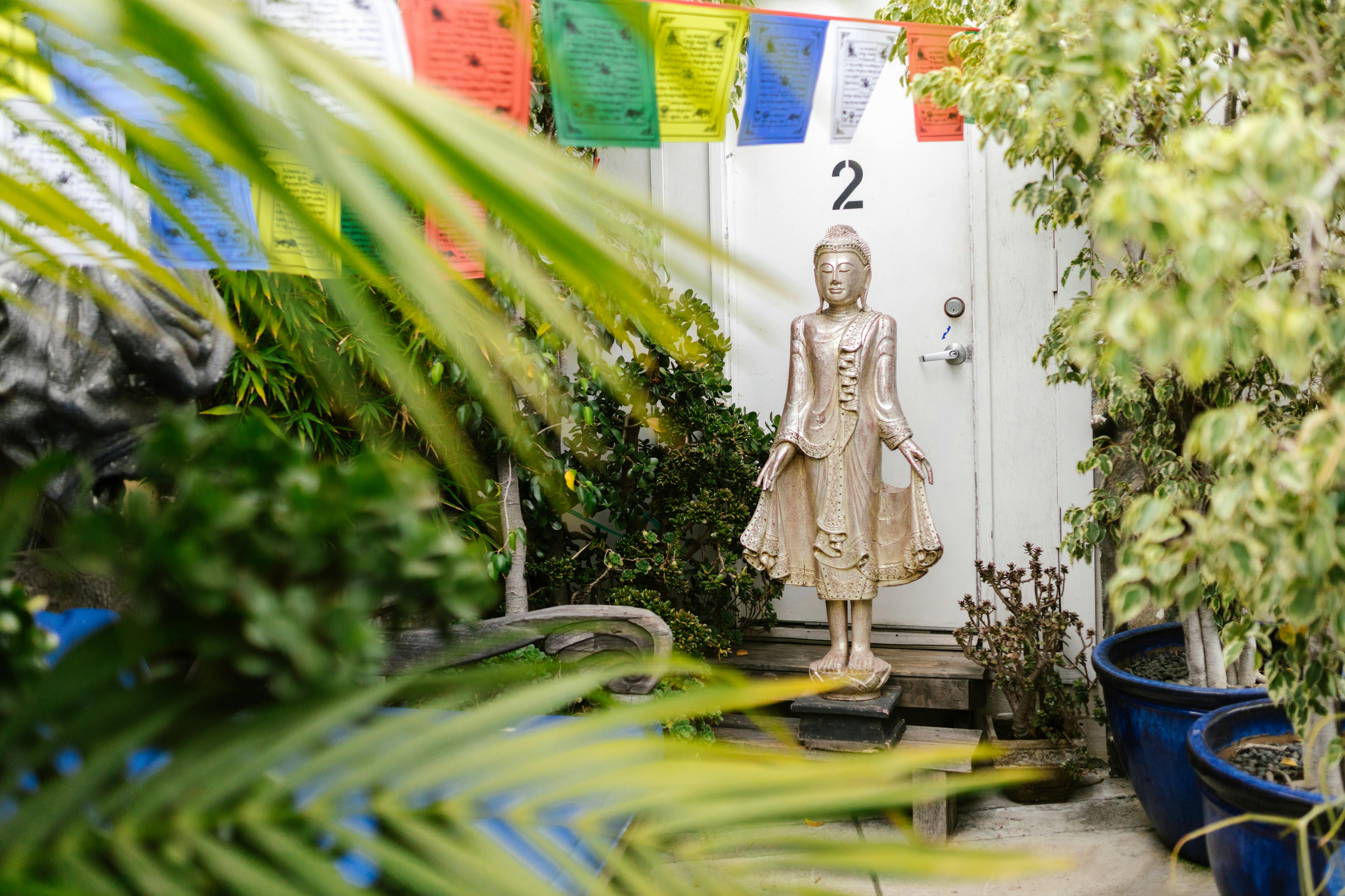 A peaceful garden adorned with a Buddha statue and colorful prayer flags embodies tranquility and spirituality. Photo Credit: Pexels @RDNE Stock project